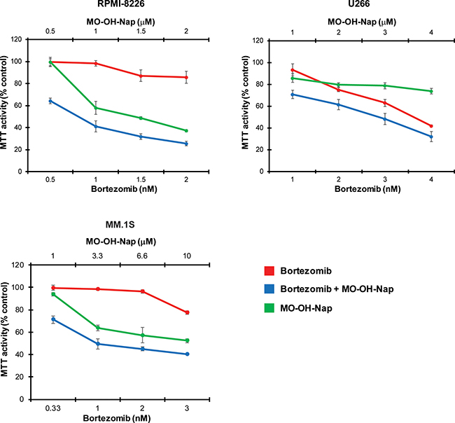 Figure 7: The combination of bortezomib and MO-OH-Nap induces synergistic cytotoxic effects in myeloma cells. MTT assays were performed following the incubation of cells with bortezomib and/or MO-OH-Nap for 48 hours. Data are expressed as percentage of control (mean ± standard deviation, n = 4).
