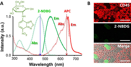 Figure 1: (A) Absorption and emission profiles of 2-NBDG and APC. Dotted arrows indicate the excitation lines. Molecular structure of 2-NBDG. (B) Confocal fluorescence microscopy images of 2-NBDG uptake for PBMC and MCF-7 incubated with 300 μM 2-NBDG for 30 minutes in samples containing cell ratios of 1:10 MCF-7:PBMC. The bars indicate 40 μm.