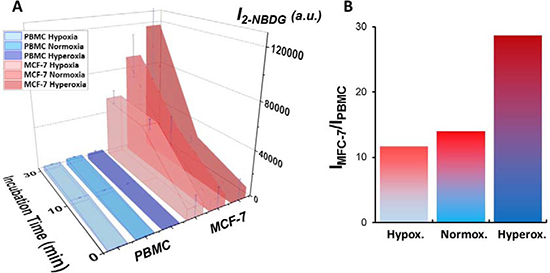 Figure 2: (A) Optimization of 2-NBDG incubation time under different microenvironments: hypoxia, normoxia, and hyperoxia. 3D Walls graph with the oxygen condition for each cell line in z-axis, incubation time (min) in x-axis, and intensity of 2-NBDG/a.u. in y-axis. The results are presented as mean ± standard deviation of three independent experiments (n = 3) for samples containing cell ratios of 1:10 MCF-7:PBMC. The median values of 10,000 cytometry events were recorded for each sample. The Kruskal-Wallis test revealed a significant difference between cancer (MCF-7) and normal (PBMC) cells in optimized conditions, p < 0.01. (B) Ratiometric difference in 2-NBDG fluorescence between PBMC and MCF-7 obtained by dividing the signal intensity of the tumor cell by that of the normal cells as a function of the oxygen conditions.