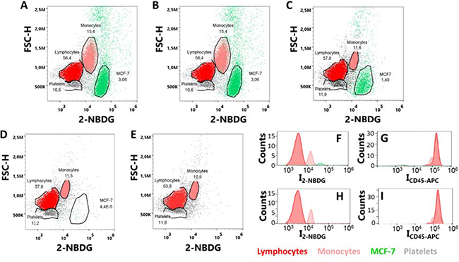 Figure 4: (A–E) Flow cytometry plots of MCF-7 and PBMCs samples with cell ratios (A) 1:10, (B) 1:100, (C) 1:1000, (D) 1:10000 and (E) only PBMCs; upon incubation with 2-NBDG and CD45-APC for 30 minutes under hyperoxia conditions. (F–I) Distributions of fluorescence intensities for (F) 2-NBDG and (G) CD45-APC, in a sample with a 1:1000 MCF-7:PBMC ratio; and (H) 2-NBDG and (I) CD45-APC, in a sample of PBMC. Over 106 single-cell events were collected for each experiment.