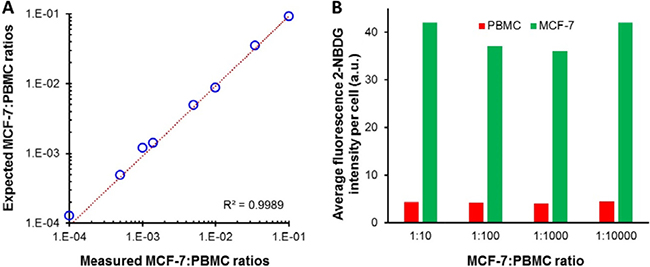 Figure 5: (A) Comparison between the expected and measured MCF-7:PBMC ratios for the samples incubated with 2-NBDG and CD-45 for 30 min under hyperoxia. (B) Normalized fluorescence intensities per cell for PBMC and MCF-7 treated with 2-NBDG under optimized oxygen content and incubation time conditions. Samples with cell ratios of 1:10, 1:100, 1:1000, and 1:10000.