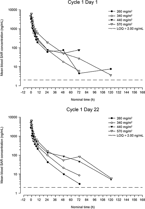 Figure 1: Mean blood concentration of SAR versus time after first infusion (cycle 1, day 1) and fourth infusion (cycle 1, day 22) (semi-logarithmic scale). LOQ = lower limit of quantification.
