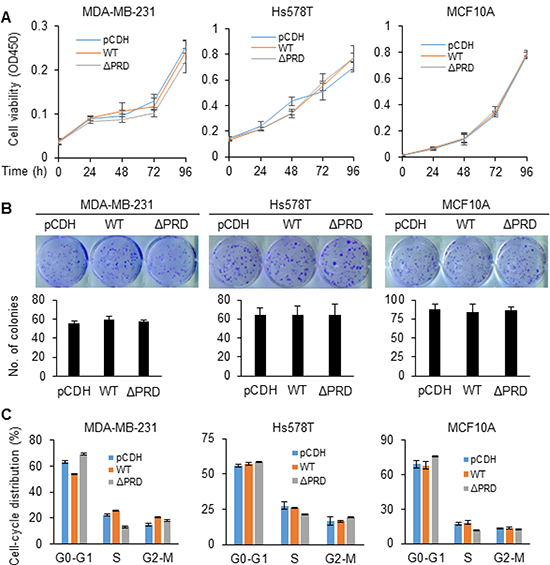 To characterize the function of MORC2 and its PRD domain in breast cancer cells, cell proliferation and cell-cycle progression of MCF10A, MDA-MB-231, and Hs578T cells stably expressing pCDH, Flag-MORC2 WT, and Flag-MORC2 ΔPRD were evaluated using Cell Counting Kit-8 (CCK-8), colony formation assay, and flow cytometry, respectively. The CCK-8 assays revealed that induced expression of either wild-type MORC2 or PRD deletion mutant did not significantly affect cell viability as compared with empty vector pCDH-infected cells (Figure 2A). Consistently, colony formation assays also demonstrated that there were no significant differences in both the size and the numbers of the colonies among cells stably expressing pCDH, Flag-MORC2 WT, and Flag-MORC2 ΔPRD (Figure 2B). In addition, flow cytometry analysis showed that cells stably expressing pCDH, Flag-MORC2 WT, and Flag- MORC2 ΔPRD did not show significant differences in cell-cycle distribution (Figure 2C). Collectively, these results suggest that induced expression of both wild-type MORC2 and PRD deletion mutant MORC2 did not significantly affect cell proliferation, colony formation, and cell-cycle progression.