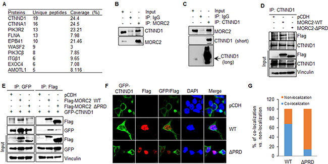 Figure 5: MORC2 interacts with CTNND1 through its PRD domain. (A) The proteins that specifically interacted with Flag-MORC2 WT were analyzed by matching unique peptide numbers and the percentage of coverage. (B, C) HEK293T cells were subjected to the sequential IP-Western blot analysis with the indicated antibodies. (D) HEK293T cells stably expressing pCDH, Flag-MORC2 WT, and Flag-MORC2 ΔPRD were subjected to IP analysis with an anti-CTNND1 antibody, followed by immunoblotting with the indicated antibodies. (E) HEK293T cells were transfected with the indicated expression vectors. After 48 h of transfection, total cellular lysates were subjected to sequential IP-Western blot analysis with the indicated antibodies. (F, G) HEK293T cells were co-transfected with the plasmids encoding pCDH, Flag-MORC2 WT, and Flag-MORC2 ΔPRD along with GFP-CTNND1, and then immunofluorescence staining was carried out using an anti-Flag antibody (F). Cell nuclei were counterstained with DAPI. The quantitative results of co-localization of GFP-CTNND1 with Flag-MORC2 and Flag-MORC2 ΔPRD are shown in G.