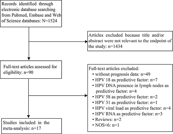 A total of 1,524 articles were retrieved by a literature search of the PubMed, Embase, and Web of Science databases, using different combinations of key terms. As shown in the search flow diagram (Figure 1), 1,524 records were initially retrieved using the predefined search strategy. After browsing the retrieved titles and abstracts, 1,434 of them were excluded due to non-relevant endpoint provided. The remaining 90 records were downloaded as full-text and checked one by one carefully. Furthermore, another 70 studies were excluded, including 49 that had no prognosis data, 7 were prognosis about HPV 18, 4 were about predictive value of HPV DNA in cervical cancer lymph nodes, 2 were about clinical outcome of HPV 58 type, 1 was about HPV 31 prognosis data, 4 were involving prognosis of HPV viral load, 3 were about prognosis of HPV RNA, 2 were about reviews, 1 was excluded due to the quality score was less than 6. As a result, 17 published studies met the criteria for analysis between HPV DNA status and cervical cancer prognosis.