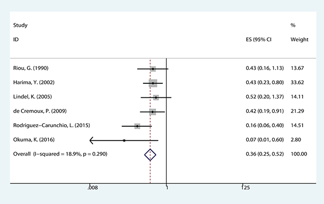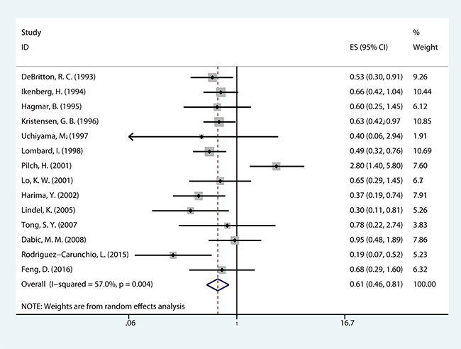 The meta-analysis of HPV DNA status was based on two outcome endpoints: OS and DFS. For OS, 14 studies in total were included in the meta-analysis, inside which, given the fact that the P value of 0.004 and I2 values of 57% calculated from the heterogeneity test, a random-effects model was used. The results shown a significant association between HPV-positive cervical cancer and OS (pooled HR = 0.610, 95% CI = 0.457–0.814, P = 0.001) (Figure 2). There were 6 studies included in the meta-analysis of DFS, of which a fixed effects model was utilized to calculate the pooled hazard ratio (HR) and 95% confidence interval (CI) on account of the P value of 0.290 and I2 values of 18.9% reported by the heterogeneity test. The results suggested that HPV-positive cervical cancer had significantly better DFS (pooled HR = 0.362, 95% CI = 0.252–0.519, P < 0.000) (Figure 3). Subgroup study was then performed, and the results suggested that HPV-positive cervical cancer was associated with good OS in Mongoloid patients (pooled HR =0.534, 95 % CI 0.355–0.804, P = 0.003), as well as in Caucasian (OS: pooled HR = 0.628, 95 % CI 0.429–0.922, P = 0.017; DFS: pooled HR = 0.355, 95% CI = 0.226–0.559, P < 0.000).