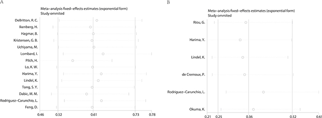 Figure 5: Sensitivity analysis of the meta-analysis. (A) overall survival (B) disease free survival.