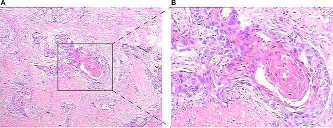 Figure 1: Hematoxylin and eosin staining of bladder urothelial carcinoma with SD ((A) Low magnification, (B) High magnification).