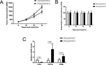 Figure 4: Knockdown of LSD1 inhibits tumor growth in vivo. (A) Tumor growth analysis in Balb/c mouse THP-1 shRNA1896 xenograft models. Final tumor volume was compared in tumor-bearing animals receiving water contained Vehicle (10 ml/kg) and Dox (2 mg/ml) with 1% sucrose. (B) Body weight change analysis in Balb/c mouse THP-1 shRNA1896 xenograft models. Final body weight was compared in tumor-bearing animals receiving water contained Vehicle (10 ml/kg) and Dox (2 mg/ml) with 1% sucrose. (C) CD11b, CD86 and LSD1 mRNA analysis by RT-PCR in Balb/c mouse THP-1 shRNA1896 xenograft model.