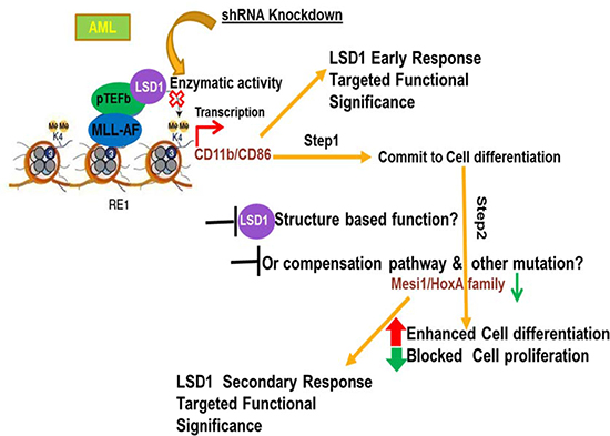 Figure 5: Proposed model of mechanism demonstrating that LSD1 regulates myeloid differentiation and oncogenic proliferation in MLL-AF9 AML cells. In MLL-AF9 AML, cellular differentiation may be divided into two stages that are differentiated controlled by LSD1 knockdown. In the first step, LSD1 inhibition quickly leads to increased CD11b and CD86 levels, which results in commitment to myeloid differentiation of cells. In the second step, with the long term sustained treatment of LSD1 knockdown, while CD11b, CD86 are continually upregulated, oncogenic genes, such as HoxA9 and Meis1, are gradually repressed in cells. As a result, cells enter into late differentiation stage and cell proliferation ability begun to be dramatically reduced.