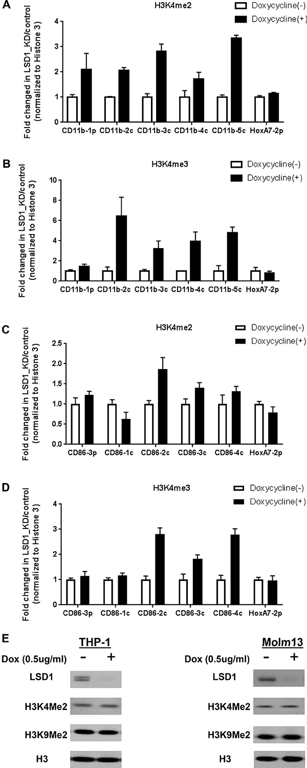 Figure 3: Knockdown of LSD1 increases H3K4me2 levels on the promoter regions of CD11b and CD86 in THP-1. (A) ChIP-qPCR analysis of H3K4me2 levels on the promoter regions of CD11b in THP-1 with Dox induced LSD1 Knockdown for 96 hours. (B) ChIP-qPCR analysis of H3K4Me3 levels on the promoter regions of CD11b in THP-1 with Dox induced LSD1 Knockdown for 96 hours. (C) ChIP-qPCR analysis of H3K4me2 levels on the promoter regions of CD86 in THP-1 with Dox induced LSD1 Knockdown for 96 hours. (D) ChIP-qPCR analysis of H3K4me3 levels on the promoter regions of CD86 in THP-1 with Dox induced LSD1 Knockdown for 4 days. (E) Western blotting analysis of global H3K4me2 and H3K9me2 levels in THP-1 and Molm13 with Dox induced LSD1 Knockdown for 96 hours. Five pairs of primers (CD11b-1p, 2c, 3c, 4c, 5c) were designed for the promoter proximal region of CD11b, five pairs of primers (CD86-3p, 1c, 2c, 3c, 4c) were designed for the promoter proximal region of CD86, with HoxA7-2p primer as the assay control. All the data are normalized to Histone 3. H3K4me2: histone 3 lysine 4 di-methylation, H3K4me3: histone 3 lysine 4 tri-methylation