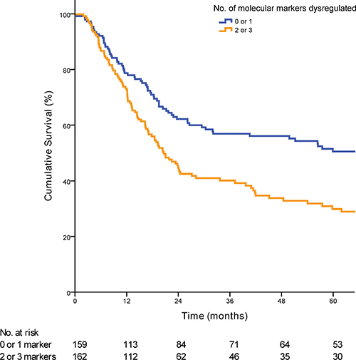 Dysregulation of 0, 1, 2 or 3 of the molecular markers showed a median survival of 60·00, 51·47, 23·35 and 18·85 months respectively (p < 0·01) (Figure 1). Each additional dysregulated molecular marker showed an increased HR by 1·47 (95% CI 1·23 to 1·80; p < 0·01). For clinical staging, patients were grouped into early stage (AJCC stage 1 and 2; n = 67) and late stage (AJCC stage 3 and 4; n = 266). When patients in the validation cohort were grouped according to the numbers of dysregulated markers, there was no statistical significant difference in the median OS between patients with 0 or 1 dysregulated marker (median OS 90·2 vs. 56·3 months; p = 0·16). Hence patients were further grouped according to either 0 or 1 marker dysregulated versus 2 and 3 markers dysregulated. Overall patients with 2 or 3 dysregulated markers showed a much poorer OS when compared with 0 or 1 dysregulated markers (median OS 66·2 vs 20·5 months; p < 0·01) (Figure 2). Post hoc power calculations of the prognostic effect of each individual and combined gene panel are detailed in Supplementary Table 3.