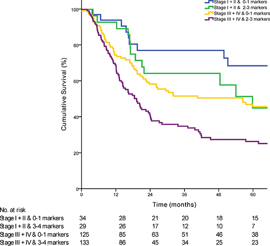 Figure 1: Kaplan-Meier curve demonstrating the survival of patients based on the number of dysregulated markers (p < 0·01). The number of patients at risk at each time point is displayed in the Table under the graph.