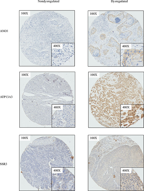 Figure 4: Representative cases illustrating immunohistochemistry staining. For ANO1, ATP13A3, SSR3, representative cases which demonstrates dysregulation versus non-dysregulation of the respective biomarker are shown.