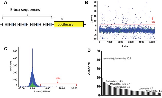 Figure 1: BHLH platform design and drug screen. (A) The reporter vector consists of 12 bHLH binding elements (E-boxes), as 4 copies of 3 unique sequences, driving luciferase. (B) A screen of repurposed libraries yielded 271 hits above 3 standard deviations from the mean and 30 above 6 standard deviations from the mean (red line). (C) A histogram illustrates that the normal distribution peak from the compounds (blue) coincides with the DMSO peak (green). (D) Seventy unique hits were confirmed in triplicate and plotted in descending Z’, revealing enrichment for the statin class of compounds.