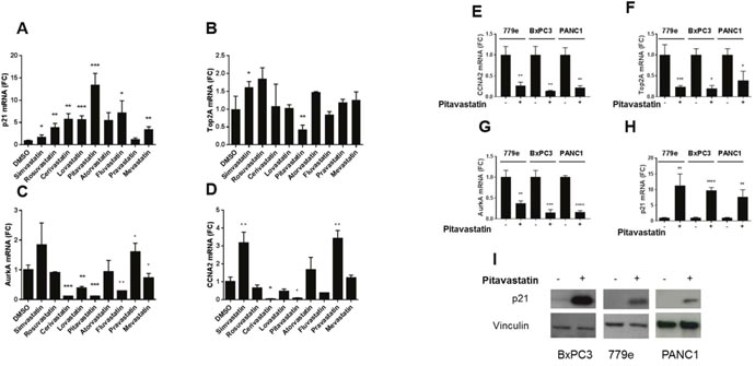 Figure 2: Statins regulate expression of cell cycle genes. (A-D) PANC1 cells treated with 10 μM of each of 9 statins for 48 hours were harvested for RT-qPCR for CCNA2, TOP2A, AURKA, and p21, shown as fold change over DMSO treated cells. (E-I) To extend the studies to additional cell lines, PANC1, BxPC3 and a low passage line derived from a patient’s tumor, 779e, were treated with 10uM pitavastatin for 48 hours. RT-qPCR analysis of (E) CCNA2, (F) TOP2A and (G) AURKA revealed significantly reduced mRNA expression in all three lines. Conversely the tumor suppressor p21 was significantly induced by pitavastatin at the (H) mRNA level, and (I) the protein level in all three lines. Data are represented as mean +/-SD, *p≤0.05, **p≤0.01, ***p≤0.001, ****p≤0.0001.