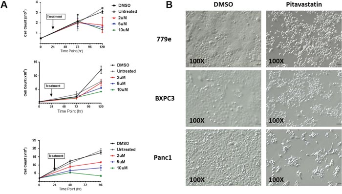Here we investigated pitavastatin treatment in 3 PDA lines, PANC1, BxPC3 and a more differentiated, low passage line recently derived from a primary tumor, 779e. In all 3 cell lines pitavastatin slowed growth which was quickly reversed in PANC1 and BxPC3 cells when drug was removed. Growth reversal was not apparent in 779e cells during the length of the experiment but these cells may simply take longer to recover as their proliferation rate is low in general.
