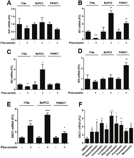 Figure 5: Pitavastatin induces DEC1 expression. PANC1, 779e and BxPC3 cells were treated with pitavastatin or vehicle for 72hrs and analyzed by RT-qPCR for (A) E47, (B) ID1, (C) ID2, (D) ID3, and (E) DEC1. (F) DEC1 expression was also assayed in PANC1 cells treated with all 9 statins. Data are shown as fold change over DMSO treated cells. Data are represented as mean +/-SD, *p≤0.05, **p≤0.01, ***p≤0.001, ****p≤0.0001.