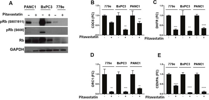 Figure 6: Pitavastatin represses Rb phosphorylation and E2F target gene expression. PANC1, BxPC3, and 779e cells +/-10 μM pitavastatin treatment were harvested for protein and RNA expression. (A) Western blot analysis of Rb phosphorylation status at Ser807/811 and Ser608, total Rb, and GAPDH control. RT-qPCR of (B) CDC6, (C) DHFR, (D) ORC1, and (E) CENPA. Data are represented as mean +/-SD, *p≤0.05, **p≤0.01, ***p≤0.001, ****p≤0.0001.