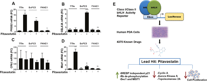 Figure 7: Pitavastatin induction of acinar differentiation genes. BxPC3, PANC1 and 779e cells treated with 10 μM pitavastatin for 48hr were harvested for RT-qPCR analysis of acinar differentiation markers: (A) PRSS2, (B) CELA3A, (C) CPA2 and (D) MIST1. Data are represented as mean +/-SD, *p≤0.05, **p≤0.01, ***p≤0.001, ****p≤0.0001. (E) A graphic model describing assay development, drug discovery and mechanistic studies with statins.
