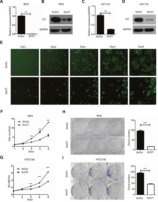 Figure 3: Knockdown of CIT inhibits human colon cancer cell growth in vitro. (A-B) Quantitative RT-PCR and western blot analysis show that CIT expression was efficiently knocked down in the RKO cells. (C-D) Quantitative RT-PCR and western blot analysis show that CIT expression was efficiently knocked down in the HCT116 cells. (E) Representative pictures of RKO cells infected with Control-shRNA (top) and CIT-shRNA (bottom) via multiparametric high-content screening (HCS) every day for five days. (F) CIT knockdown inhibits the proliferation of RKO cells. ***P<0.001 vs. sh-Ctrl. (G) CIT knockdown inhibits the proliferation of HCT116 cells. ***P<0.001 vs. sh-Ctrl. (H-I) Colony formation assay of RKO and HCT116 cells after infection with sh-Ctrl and sh-CIT lentivirus. ***P<0.001 vs. sh-Ctrl.