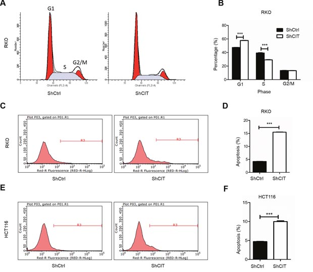 Figure 5: Knockdown of CIT induces cell cycle arrest and apoptosis. (A-B) Flow cytometry analysis of the cell cycle reveals that CIT knockdown induces RKO cell cycle arrest at the G1 phase (G1 phase: 47.34% ± 0.52% vs. 57.72% ± 0.40%; S phase: 39.28% ± 0.78% vs. 29.14% ± 0.34%; and G2/M phase: 13.38% ± 0.31% vs. 13.14% ± 0.53%). ***P<0.001 vs. sh-Ctrl. (C-D) Flow cytometry analysis of apoptosis reveals that the rates of apoptosis of RKO cells are significantly increased by CIT knockdown (5.02% ± 0.29% vs. 19.60% ± 0.29%). ***P<0.001 vs. sh-Ctrl. (E-F) Flow cytometry analysis of apoptosis reveals that the rates of apoptosis of HCT116 cells are significantly increased by CIT knockdown (4.70% ± 0.13 vs. 9.99% ± 0.34%). ***P<0.001 vs. sh-Ctrl.