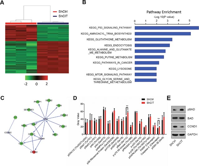 Figure 6: Down-regulation of CIT affects the p53 and apoptosis pathways. (A) Heat map of 885 genes (295 genes up-regulated and 590 genes down-regulated) showing significant differential expression patterns in RKO cells infected with sh-Ctrl or sh-CIT lentivirus (criteria: P<0.05 and absolute fold change >1.5). (B) Functional pathway enrichment of differential genes analyzed based on the KEGG and BIOCARTA databases. The P53 signaling pathway was the most significantly enriched pathway (P=1.44E-06). (C) Interaction network between CIT and the genes involved in the KEGG pathway P53. Green circles represent down-regulated genes, red circles represent up-regulated genes, and gray circles represent genes with no change in expression. (D) The post-translational modification of 18 important signaling proteins (16 phosphorylation proteins and 2 cleavage proteins) was monitored by array hybridization. CIT knockdown increases Bad phosphorylation and Caspase-3 cleavage in RKO cells. **P<0.01 vs. sh-Ctrl. (E) CIT knockdown regulates Bad and CCND1. RKO cells were infected with sh-CIT or sh-Ctrl for 48 h. Then, cell lysates were subjected to western blotting with the indicated antibodies. GAPDH was used as an internal control.