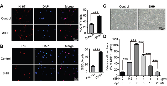 Figure 2: Exogenous SHH ligands promote the proliferation of CAFs in vitro. (A) Representative fluorescent images and statistical analyses of the relative number of Ki-67-labeled (red) CAFs after 48 h treatment with rSHH (1 μg/ml). The nuclei were stained with DAPI (blue). (B) Representative fluorescent images and statistical analyses of the relative number of EDU-positive (red) CAFs after 48 h treatment with rSHH (1 μg/ml). The nuclei were stained with DAPI (blue). (C) Representative images of CAFs after 48 h treatment with rSHH (1 μg/ml). (D) Detection of relative viability of CAFs in the absence or presence of rSHH or Cyclopamine intervention at various doses for 48 h. Data are expressed as mean ± s.e.m. (***P<0.001, ****P<0.0001).