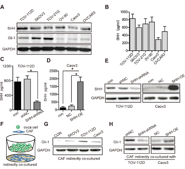 Figure 3: OC cell-derived SHH activates Hh signaling of CAFs. (A) Western blot analysis of SHH and Gli-1 expression in OC cells. GAPDH served as the loading control. (B) ELISA of SHH ligand secreted by OC cells. (C) ELISA of SHH ligand secreted by TOV-112D cells stably transfected with either shNC or SHH-shRNA lentivirus. (D) ELISA of SHH ligand secreted by Caov3 cells stably transfected with either NC or SHH-OE lentivirus. (E) Western blot analysis of SHH and Gli-1 in TOV-112D and Caov3 cells stably transfected with lentivirus. (F) Schematic depicting of indirectly co-cultured OC cells and CAFs from the top to bottom. (G) Western blot analysis of Gli-1 expression in CAFs that were indirectly co-cultured with SKOV3, TOV-112D or CAOV3 cells. CAFs cultured alone were used as the control. (H) Western blot analysis of Gli-1 expression in CAFs that were indirectly co-cultured with TOV-112D and Caov3 cells stably transfected with lentivirus. Data are expressed as mean ± s.e.m. (*P < 0.05).