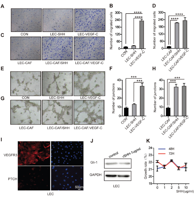 Figure 4: Activation of the Hh signaling pathway in CAFs promotes the migration and capillary tube formation of LECs in vitro. (A) and (B) Representative images and statistical analyses of cellular migration of LECs treated with rSHH (1 μg/ml) or ECM. The group with VEGF-C (5 ng/ml) was the positive control. (C) and (D) Representative images and statistical analyses of migration of LECs in a co-culture invasion system with CAFs treated with or without rSHH. The group with VEGF-C (5 ng/ml) was the positive control. (E) and (F) Representative images and statistical analyses of in vitro capillary tube formation of LECs treated with rSHH (1 μg/ml) or ECM. LECs treated with VEGF-C (5 ng/ml) was the positive group. (G) and (H) Representative images and statistical analyses of capillary tube formation of LECs treated with supernatants from cultures of CAFs alone or from CAFs treated with rSHH (1 μg/ml). The group with VEGF-C (5 ng/ml) was the positive control. (I) Representative fluorescent images of VEGFR3- (red), PTCH- (red) and DAPI-labelled (blue) LECs. VEGFR3 is the positive marker for LECs as a membranous protein. (J) Western blot analysis of Gli-1 expression in LECs after 48 h treatment with rSHH (1 μg/ml). GAPDH served as the loading control. (K) CCK8 assay detected the growth rate of LECs at 48 h and 72 h after treatment with rSHH at various doses. The data are expressed as the mean ± s.e.m. (***P<0.001, ****P<0.0001).