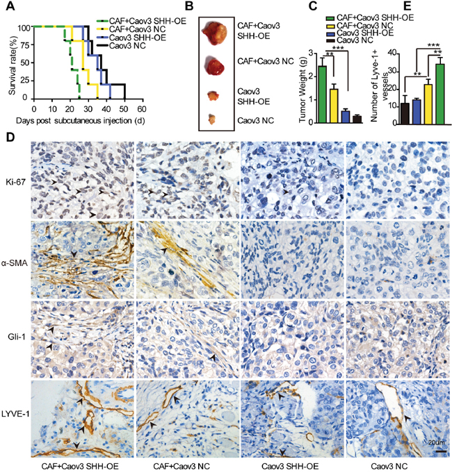 Figure 6: Paracrine signaling of tumour-derived SHH in CAFs promotes lymphangiogenesis in vivo. (A) Growth properties of subcutaneous tumours in mice derived from Caov3 SHH-OE or Caov3 NC cells alone or co-injected with CAFs. Kaplan-Meier plot of time to tumour progression, as evidenced by survival rates over time (n=5). (B) Bright field images of subcutaneous tumours from each group (n=5) 20 days after tumour implantation. (C) Graphical representation of the weights of subcutaneous tumours from each group 20 days after tumour implantation. (D) Immunohistochemical staining for Ki-67, α-SMA, Gli-1 and LYVE1 in tumour sections from mice in each group. (E) Graphical representation of the number of LYVE1+ vessels counted from IHC images in panel D. (*P<0.05, **P<0.01, ***P<0.001).