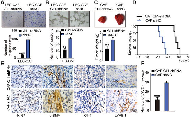 Figure 7: Inhibition of Hh signaling in CAFs blocks its effects on lymphangiogenesis in vivo and in vitro. (A) Representative images and statistical analyses of migration of LECs in a co-culture invasion system with CAFs stably transfected with shNC or Gli-shRNA lentivirus in the presence of rSHH (1 μg/ml). (B) Representative images and statistical analyses of capillary tube formation of LECs treated with supernatants from cultures of CAFs stably transfected with shNC or Gli-shRNA lentivirus in the presence of rSHH (1 μg/ml). (C) Bright field images and graphical representation of the weights of tumours of subcutaneous tumours from mice (n=5) bearing Caov3 SHH-OE cells co-injected with CAFs stably transfected with shNC or Gli-shRNA lentivirus 20 days after tumour implantation. (D) Growth properties of subcutaneous tumours in mice derived from Caov3 SHH-OE cells co-injected with CAFs stably transfected with shNC or Gli-shRNA lentivirus. Kaplan-Meier plot of time to tumour progression, as evidenced by survival rates over time. (E) IHC staining for Ki-67, α-SMA, Gli-1 and LYVE1 in tumour sections from mice in the two groups. (F) Graphical representation of the number of LYVE1+ vessels counted from IHC images in panel E. (**P<0.01, ***P<0.001).