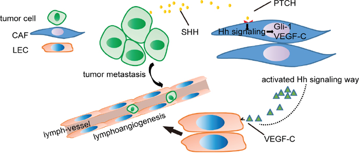 Figure 8: Schematic of OC cell-mediated Hh signalling in CAFs and the VEGF-C feed-forward loop. Hh ligands secreted by OC cells activate Hh signalling in CAFs. Then, Hh signalling in CAFs results in the expression of VEGF-C that facilitates the migration and capillary tube formation of LECs, thus promoting tumour metastasis.