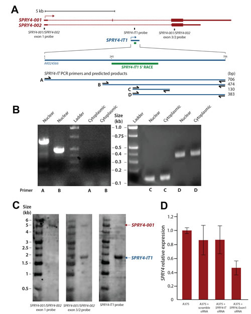 Figure 1:Maturation and Cellular Compartmentalization of SPRY4-IT1 Transcripts (A) The sequence and location of SPRY4 and SPRY4-IT1. SPRY4-IT1 is embedded in the SPRY4 parent transcript. SPRY4-IT1 starts in the first intron of the SPRY4 gene and extends up to exon 3. 5′ RACE shows the maturation and cleavage of a 244 nt transcript in the 5′ region of SPRY4-IT1. (B) Detection of nuclear and cytoplasmic forms of SPRY4-IT1. (C) Northern blot analysis shows the sizes of SPRY4 (4.9 kb) and SPRY4-IT1 (1.8 kb). The SPRY4 exon 1 probe hybridizes specifically to SPRY4, but the SPRY4 exon 3 probes recognize both SPRY4 and SPRY4-IT. (D) SPRY4 exon 1 siRNA knocks down the expression of SPRY4, but not SPRY4-IT1, in A375 melanoma cells.