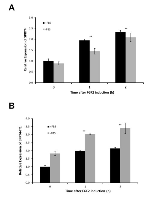Figure 2: SPRY4 and SPRY4-IT1 Are Coordinately Regulated in Melanocytes Relative expression of SPRY4-IT1and SPRY4 following induction by FGF2. Melanocytes were treated with 10 ng/ml FGF2 for 1 or 2 h in the presence or absence of FBS, and the fold change in expression of SPRY4 (A) and SPRY4-IT1 (B) was measured by qPCR