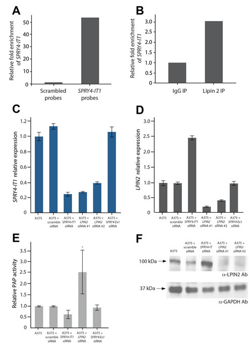 Figure 4:SPRY4-IT1 Knockdown Increases Lipin 2 Protein Accumulation in Melanoma Cells A) Affinity purification of SPRY4-IT1 from A375 cell lysates with SPRY4-IT1-specific probes followed by qPCR. SPRY4-IT1 is enriched compared to scrambled (control) probes. U1 RNA was used as endogenous control for pull-downs. (B) qPCR validation showing enrichment of SPRY4-IT1 following immunoprecipitation of A375 cell lysates with lipin 2-specific or control IgG antibodies. (C) Relative expression of SPRY4-IT1 in lipin 2 knock-down cells (D) Relative expression of lipin 2 after siRNA-mediated knockdown of SPRY4-IT1, SPRY4 exon 1 or lipin 2. (E) Phosphatidic acid phosphatase assay. (F) Western blot analysis of lipin 2 following siRNA-mediated knockdown of SPRY4-IT1 or lipin 2. All experiments were performed in triplicate.