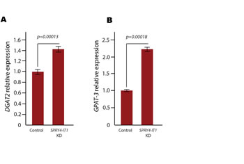 Quantitative PCR was carried out using TaqMan mRNA or SYBR Green mRNA assays with a 7500 Real-Time PCR System (Applied Biosystems/Life Technologies), in accordance with the manufacturer’s protocols. SDS1.2.3 software (Applied Biosystems) was used for comparative Ct analysis, with 18S rRNA serving as the endogenous control. Primers for SYBR qPCR were as follows: SPRY4-IT1 qPCR For, gctgagctggtggttgaaaggaatc; SPRY4-IT1 qPCR Rev, gcttggcccacgatgacttgg; SPRY4 Exon 1 qPCR For, ggcagtggttgcaacatcgccg; SPRY4 Exon 1 qPCR Rev, tagccgccgctgtactcgcagac; LPIN2 qPCR For, cgtctaagcagcccttctatgctgc; LPIN2 qPCR Rev, acatgctccacgagctcactcagc; LPIN1 qPCR For, ggagagctggtacaggaacatgcaaag; LPIN1 qPCR Rev, gcagtggctctctccaaaaggtgaag; GPAT3 qPCR For, caaggaggcctgactgaacttccc; GPAT3 qPCR Rev, ccgtcctcttagctgagagatccattg; DGAT1 qPCR For, caacaaggacggagacgccgg; DGAT1 qPCR Rev, gatgccacggtagttgctgaagcc; DGAT2 qPCR For, ctgcactgattgctggctcatcg; and DGAT2 qPCR Rev, gaaagtagcgccacacagcccag.