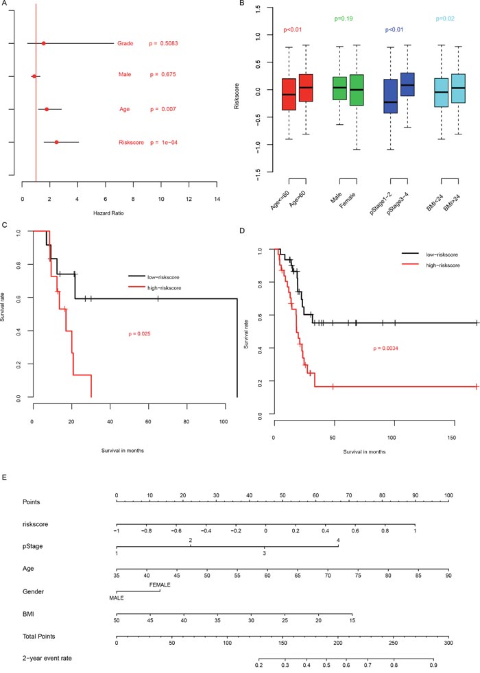 Figure 3: Clinical information and risk score. The clinical significance of clinical information and risk score (A), and association between them (B). The performance of risk score on patients underwent radiation (C) and without radiation (D) was also plotted. A nomogram containing clinical information and risk score was plotted (E).
