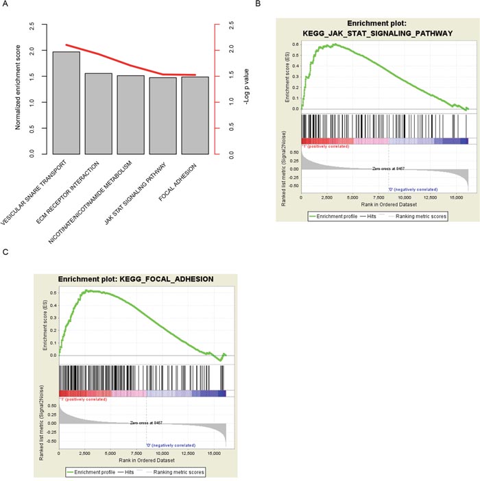 Figure 4: KEGG pathways associated with risk score. The high-risk score associated pathways were calculated (A) with GSEA, and JAK-STAT signaling pathway (B) and focal adhesion (C) were noted.