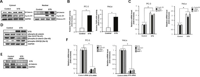 Because cytosolic β-catenin accumulation induces its translocation into the nucleus, where it interacts with various transcription factors of the TCF family such as TCF4, we determined whether STS increases β-catenin/TCF4 transcriptional activity [17, 19, 38–40]. STS expression induced β-catenin accumulation in the nucleus, and the level of cyclin D1, a downstream target of β-catenin, was also strongly increased (Figure 2A). Overexpression of STS caused an approximately 4-fold increase of TOPFLASH activity in PC-3 and HeLa cells (Figure 2B). As the β-catenin/TCF complex activates the transcription of specific target genes [21, 41], we measured the mRNA levels of cyclin D1, c-myc, and MMP-7 genes after STS overexpression in both PC-3 and HeLa cells. As shown in Figure 2C, STS was able to induce expression of all of these genes. Previous report showed that GSK3β and CKIα may control β-catenin level by phosphorylation of β-catenin on Ser-33/37/Thr-41 and Ser-45, respectively, which can promote ubiquitin-dependent degradation of β-catenin [42]. In contrast, phosphorylation of GSK3β on Ser-9 by various serine/threonine kinases including PKA, PKC, Akt, p70S6K, or p90RSK which inhibits GSK3 kinase activity can enhance the stability of cytoplasmic β-catenin [43, 44]. As expected, STS decreased β-catenin phosphorylation on Ser-33/37/Thr-41 and on Ser-45, but it induced the phosphorylation of GSK3β on Ser-9 (Figure 2D). To ensure the role of STS on β-catenin expression, the effect of STS gene knockdown was determined. When cells were treated with STS siRNA, both protein and mRNA levels of STS were reduced (Figure 2E and 2F). STS siRNA also significantly suppressed the protein level of β-catenin (Figure 2E) and the mRNA levels of cyclin D1, c-myc, and MMP-7 (Figure 2F).