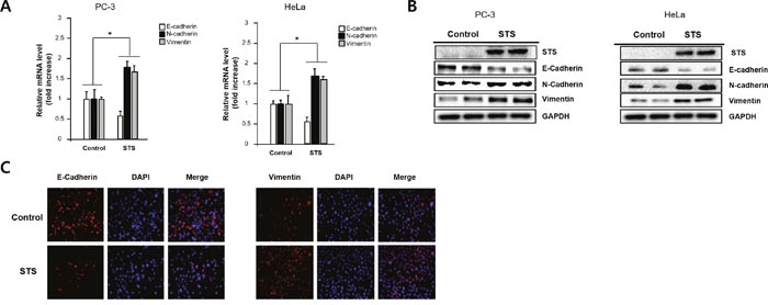 Figure 3: STS induces EMT in both PC-3 and HeLa cells. Cells were transfected with pcDNA3.1-STS for 48 h. (A) Total RNA was isolated and mRNA expression of STS, E-cadherin, and N-cadherin were determined by qPCR. (B) Total cellular protein (20 μg) was subjected to Western blot analysis with STS, E-cadherin, N-cadherin, and vimentin antibodies. GAPDH was used as a loading control. (C) PC-3 cells were cultured on cover slips and transfected with pcDNA3.1-STS for 48 h. Cells were fixed, incubated with E-cadherin or vimentin antibody, stained with Alexa Fluor 594-labeled secondary antibody, and photographed by fluorescence microscope.