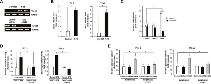 Figure 4: STS induces Twist1 expression in cancer cells. (A) PC-3 cells were transfected with pcDNA3.1-STS or STS siRNA (50 nM) for 48 h. Total RNA was isolated, and mRNA expression of Twist1 was determined by qPCR. Expression of GAPDH mRNA was determined as an RNA control. (B) Cells were transfected with pcDNA3.1-STS. Total RNA was isolated, and mRNA expression of Twist1 was determined by qPCR. Each data point represents the mean ± S.E.M. of three experiments. *p<0.05 compared with control. (C) Cells were treated with DHEA or DHEAS (100 nM) for 24 h. Total RNA was isolated, and mRNA expression of Twist1 and E-cadherin were determined by qPCR. Expression of GAPDH mRNA was determined as an RNA control. (D) Cells were transfected with pcDNA3.1-STS, Twist1-HRE promoter, Twist1-HRE mutant promoter, and renilla luciferase vector for 24 h. The relative firefly luciferase activity, normalized by the renilla luciferase activity, is shown. Each data point represents the mean ± S.E.M. of three experiments. *p<0.05 compared with control. #p<0.05 compared with Twist1-HRE promoter vector transfected cells. (E) Cells were transfected with Twist1-HRE promoter, Twist1-HRE mutant promoter, and renilla luciferase vector for 24 h and then were treated with DHEA or DHEAS (100 nM) for 24 h. The relative firefly luciferase activity, normalized by the renilla luciferase activity, is shown. Each data point represents the mean ± S.E.M. of three experiments. *p<0.05 compared with control. #p<0.05 compared with Twist1-HRE promoter vector transfected cells.