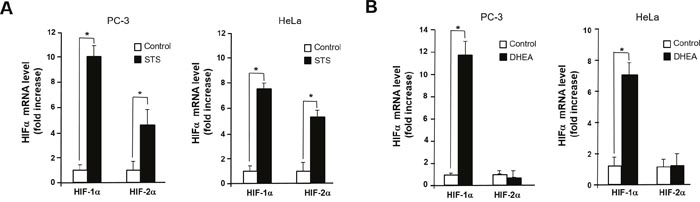 Figure 5: STS induces transcription of HIF-1α and HIF-2α. (A) Cells were transfected with pcDNA3.1-STS. Total RNA was isolated, HIF-1α and HIF-2α genes were amplified with specific primers. (B) Cells were treated with DHEA (100 nM). Total RNA was isolated, mRNA expression of HIF-1α and HIF-2α were determined by qPCR. Genes were amplified with specific primers. Each data point represents the mean ± S.E.M. of three experiments. *p<0.05 compared with control.