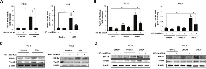 Given that activation of HRE site is required for inducing Twist1 expression by STS, we tested whether HIF-1α is essential for STS-mediated Twist1 expression. As shown in Figure 5A, HIF-1α and HIF-2α mRNA transcription was significantly induced by STS expression in PC-3 and HeLa cells. Interestingly, DHEA was able to induce HIF-1α transcription but it failed to induce HIF-2α transcription (Figure 5B). STS-mediated Twist1 induction was HIF-1α-dependent because HIF-1α siRNA strongly attenuated Twist1 expression by STS in mRNA and protein levels (Figure 6A and 6C). In addition, HIF-1α siRNA also repressed DHEA-mediated Twist1 induction (Figure 6B and 6D). These results demonstrate that STS and DHEA may induce Twist1 expression via HIF-1α activation.