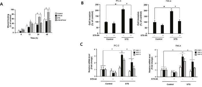 Figure 8: STS enhances cell migration and invasion in human cancer cells. (A) Scratch wound assay. Cells were transfected with pcDNA3.1-STS, and treated with STX-64 (4 μM) for 24 h. An injury line was created, and plates were photographed at 0 h to 48 h. (B) Invasion assay. Cells were transfected with pcDNA3.1-STS for 24 h and transferred to an invasion chamber insert. Cell invasion was analyzed by using QCMTM 24-well Cell Invasion Assay Kits. *p<0.05 compared with untreated control cells. #p<0.05 compared with only STS-overexpressed cells. (C) qPCR. Cells were transfected with pcDNA3.1-STS, and treated with STX-64 (4 μM) for 24 h. Total RNA was isolated and mRNA expression of MMP-1, MMP-2, and MMP-9 were determined by qPCR. Each data point represents the mean ± S.E.M. of three experiments. *p<0.05 compared with untreated control cells. #p<0.05 compared with only STS-overexpressed cells.