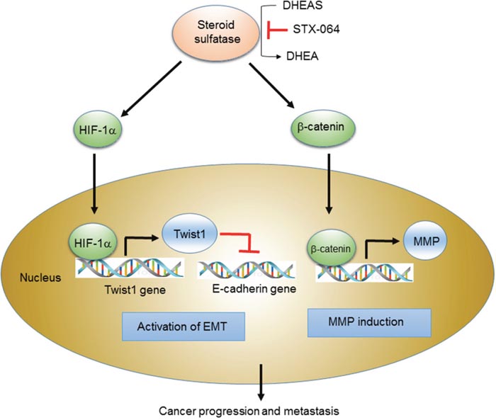 To study the functional role of STS on the Wnt/β-catenin signaling pathway and EMT to elucidate how STS expression modulates cancer progression in human cancer cells, we measured multiple hallmarks of cancer progression including cancer cell invasion and migration following STS overexpression or knockdown. Moreover, to determine the importance of STS-mediated steroid metabolism, the effects of DHEA and DHEAS on EMT were compared. We investigated further the interplay between STS, HIF-1α, and Twist1, which contributes to the gene expression responsible for EMT. We show that STS-induced Twist1 expression is mediated in a HIF-1α–dependent manner in human prostate and cervical cancer cells. These findings provide novel insight into how high level expression of STS in cancer can promote cancer progression and metastasis.