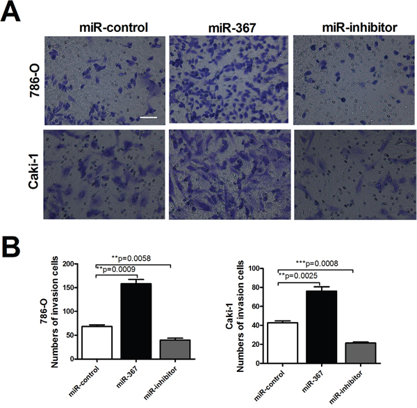 Figure 4: MiR-367 increased the number of invasion cells in ccRCC. (A) Transwell assays with Matrigel of 786-O and Caki-1 cells transfected with miR-367 or miR-367 inhibitor. Scale bar indicates 100 μm (B) Quantitative analysis of the number of invasive cells. Data are expressed as mean ± SEM. **p<0.01 vs. miR-control.
