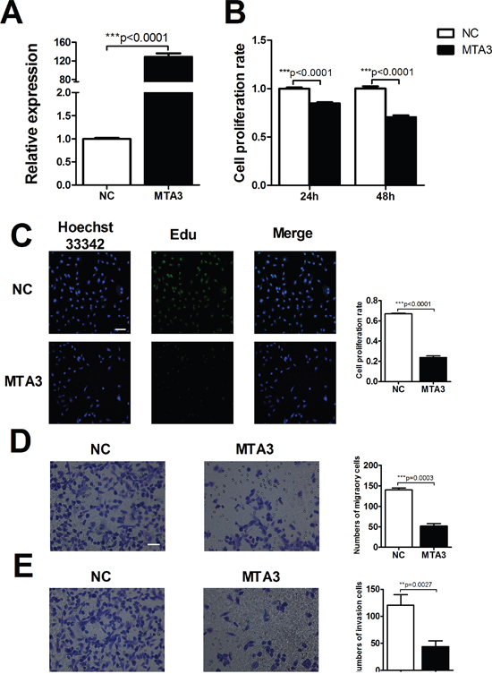 Figure 7: MTA3 is involved in ccRCC proliferation and metastasis. (A) Transfection efficiency of MTA3 overexpression was assessed by qRT-PCR. (B) MTT assay to confirm the ability of MTA3 on ccRCC cell viability. (C) After treatment with MTA3 plasmid, the proliferation rate of 786-O cells was determined by EdU kit. (D and E) Representative micrographs (left) were showed. Relative quantification (right) of cell migration (top) and invasion (bottom) were measured after infected with negative control (NC) or MTA3 in 786-O cells. Scale bar indicates 100 μm. Data are expressed as mean ± SEM. **p<0.01 or *p<0.05 vs. NC.