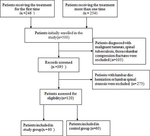 500 patients diagnosed with LBP were primarily admitted to our study between October 2007 to December 2016 from our hospital. The age of the patients ranged from 30 to 70 years old. We excluded the patients from the studies if they were diagnosed with malignant tumors, spinal tuberculosis, thoracolumbar compression fractures (n = 105). A total number of 395 patients were left after this screening. Patients with lumbar disc herniation or lumbar spinal stenosis were also excluded (n = 275). 120 patients were assessed for eligibility finally. 60 patients with positive results of provocation discography were selected as study group and 60 patients with negative results of provocation discography were regarded as control group (Figure 1). All the characteristics and radiographic results of enrolled patients were specifically listed in the Table 1.