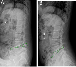 Figure 2: Angular motion of a 48 years old man,diagnosed with discogenic low back pain (LBP) for 2 years. (A) delineates flexion angle measured by X-ray (L4-5). (B) indicates the extension angle measured by X-ray (L4-5).